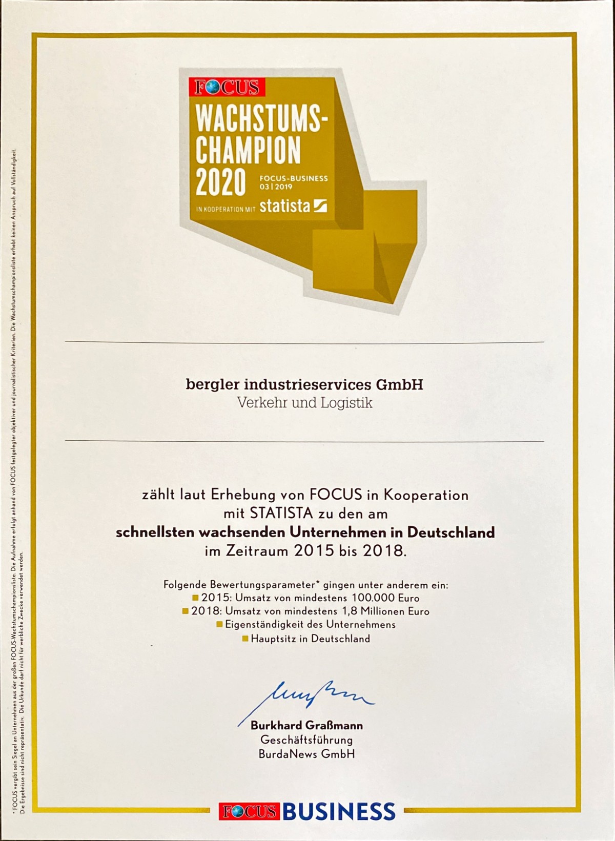 Über diese Auszeichnung haben wir uns besonders gefreut: Wir sind Wachstumschampion 2020! Das Wirtschaftsmagazin Focus Business nimmt gemeinsam mit dem Statistik- und Marktdatenportal Statista über 12.000 Unternehmen aus ganz Deutschland unter die Lupe und ermittelt ein Ranking aus 500 Unternehmen, die sich in den letzten Jahren in puncto Umsatz- und Mitarbeiterwachstum prozentual am stärksten entwickelt haben. Dazu gehören auch wir! In der Gesamtwertung liegt die bergler industrieservices GmbH im oberen Mittelfeld auf Platz 245 – in unserer Unternehmenskategorie Verkehr und Logistik auf Platz 15!