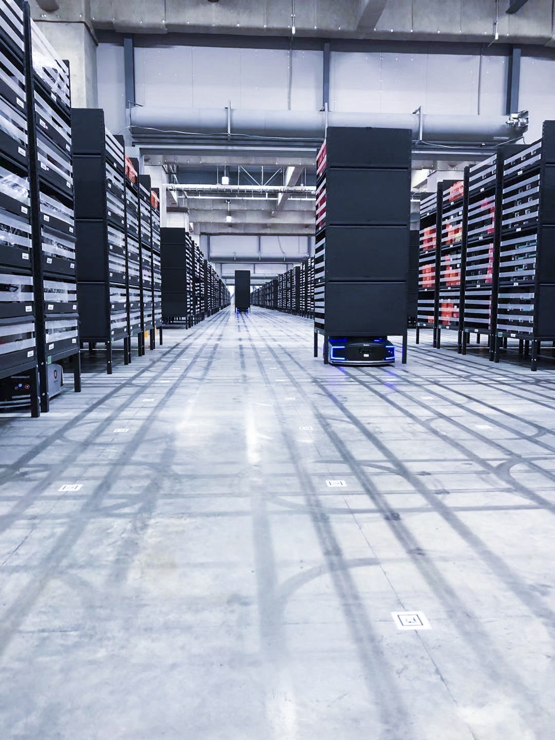 Natürlich lässt sich auch der verfügbare Platz am Lagerstandort Erlensee noch effizienter nutzen. Hier steigt unsere Lagerdichte steigt, weil die speziell konzipierten Regale räumlich viel enger aufgestellt werden können, als konventionelle Hochregale. Hier, wo autonome Roboter die Lagerregale von unten anfahren, anheben und wegfahren muss sich eben kein Mensch mehr dazwischendrängen können.