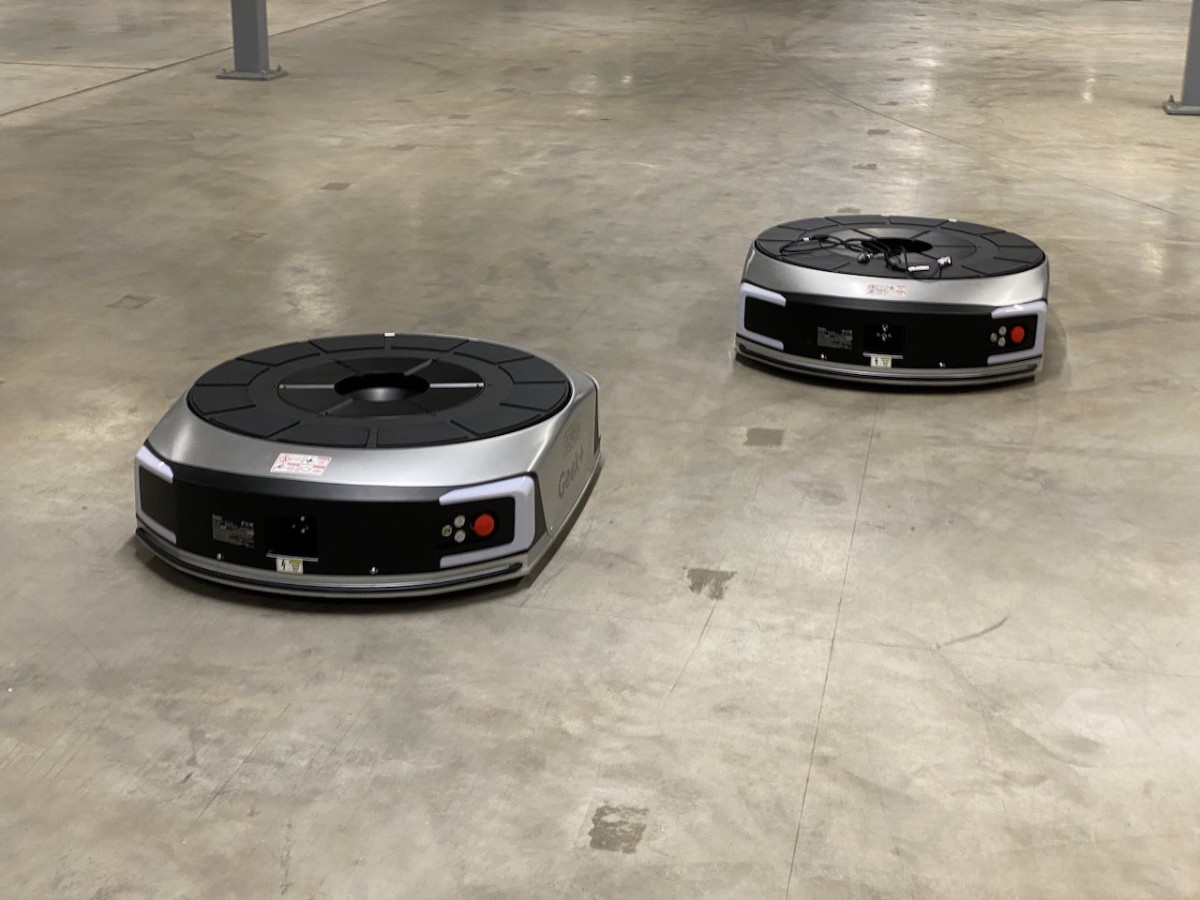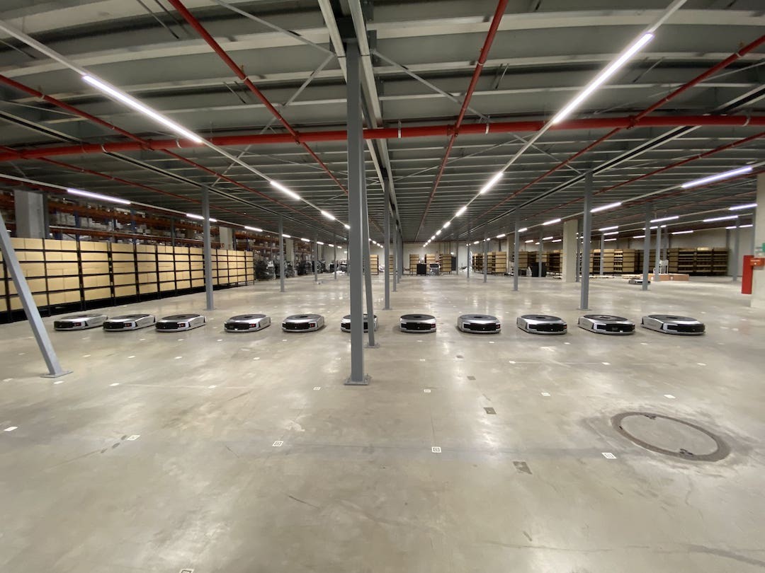 Die Flotte wächst! Inzwischen stehen die ersten Roboter auf der Fläche bereit und warten nur darauf, loszufahren, die Lagerregale huckepack zu nehmen und zur Übergabestation in die Kommissionierzone zu fahren, wo dann der schließlich Mensch das Picking der Artikel übernimmt. Jene Übergabestation und auch der Schutzzaun stehen bereits als nächstes auf unserer Liste der Aufbauarbeiten. Dann ist hier im Lager noch mehr zu sehen und natürlich halten wir Sie weiter auf dem Laufenden, was den Fortschritt betrifft.